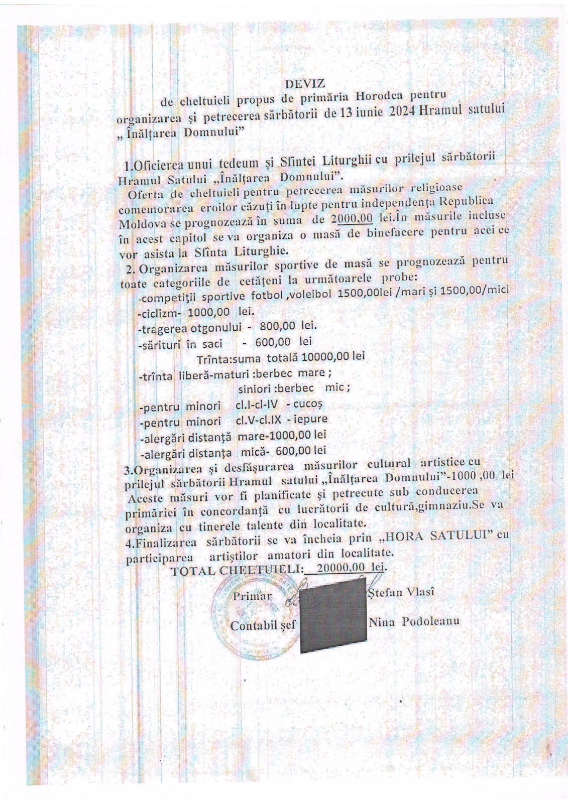 Deviz de cheltuieli propus de primăria Horodca pentru organizarea și petrecerea sărbătorii de 13 iunie 2024 Hramul satului "Înălțarea Domnului".